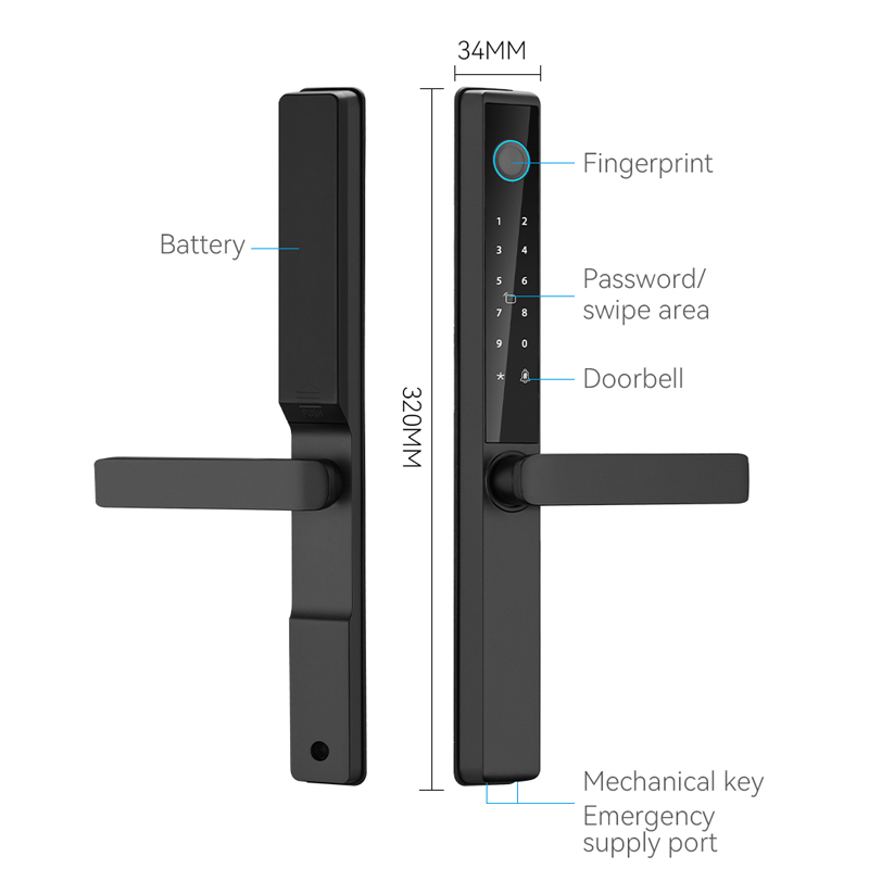 ارتقِ بأمان وراحة منزلك من خلال قفل الباب الرقمي المقاوم للماء IP65، المدمج مع نظامي Tuya وTTlock الذكيين. يجمع هذا القفل الذكي الشامل بين الحماية القوية وطرق الفتح المتنوعة والاتصال الذكي، وهو مثالي للمنازل والمكاتب الحديثة والسيناريوهات شبه الخارجية مثل الفيلات. مصنوع من الألومنيوم المؤكسد عالي الجودة، ويتميز بتصميم أنيق وأداء موثوق به في البيئات القاسية.